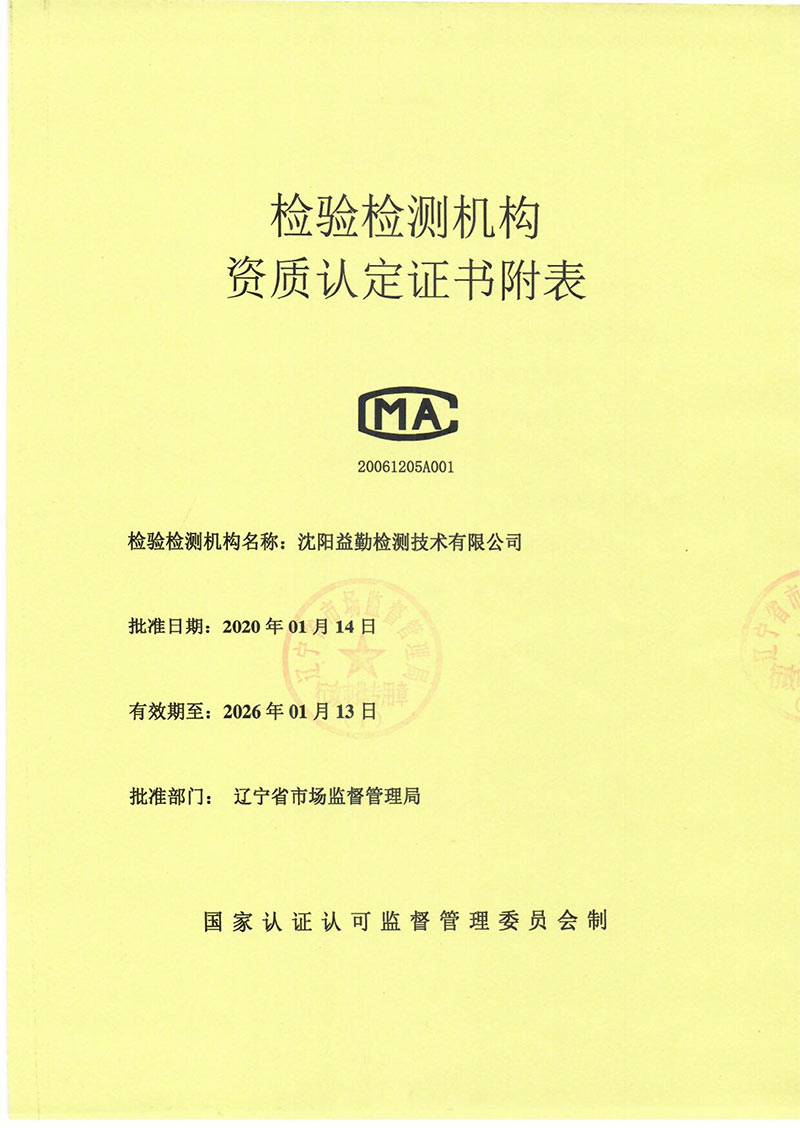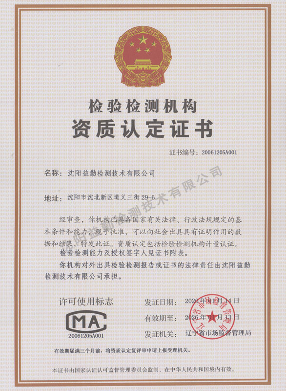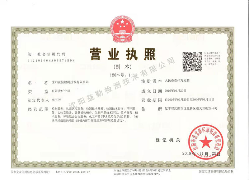 沈陽益勤檢測技術(shù)有限公司是具有獨立法人資格的第三方檢測服務(wù)機構(gòu),公司成立于2013年2月,注冊資金1000萬元,位于沈陽市沈北新區(qū)道義三街29-6.公司已獲得CMA認證,可提供地表水、地下水、生活污水、工業(yè)廢水、環(huán)境空氣、污染源廢氣、室內(nèi)空氣、土壤質(zhì)量、固體廢物、和噪聲等方面提供環(huán)境檢測服務(wù),可滿足各單位在驗收比對、環(huán)境影響評價現(xiàn)狀檢測、管理體系審核檢測、污染源常規(guī)檢測、等多方面的環(huán)境檢測需求。 檢驗檢測機構(gòu)資質(zhì)認定證書 營業(yè)執(zhí)照
